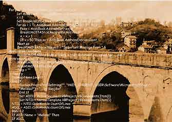 source code from the melissa virus is placed over a digitally altered photograph of the ottoman bridge of visegrad, bosnia, famously described in ivo andric's novel bridge on the river drina, suggesting a somewhat darker side to the bridge as an architectural and/or communicative element.