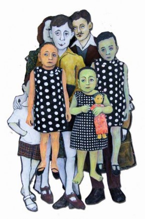 Funny, concise and original work comes from Andjela Mujcic. Her figures, similar to those in old photos, carefully painted and than cut out from hardboard, look at us with enigmatic, paradigmatic, joking, nutty expressions. They seem to be more surprised at what they see (and they see us) than we are at what we see (and we see them). What must we look like? The legitimacy of the strategy to adopt whatever they like gives the modern artist countless possibilities for creating their own works of art. We can find these tendencies in Andjela’s poetics. Her characters, having left photos and beeing uotside the frame (the frame in the traditional understanding of the painting, as a rectangular frame over which canvass is stretched), are recontestualised – they reject the old and get a new meaning. Andjela chellenges the limitations of the medium intelligently placing some figures in the upper part of the frame, i.e. placing the small-size projections of the classic painting and the enlarged pictures of the objects of the same motive one next to other.
